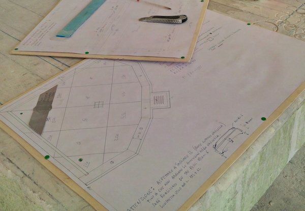 Partendo da questo, ho prima realizzato un disegno in scala 1:10. Da quel disegno ho realizzato delle dime in scala 1:1 per rappresentare in modo reale le dimensioni della pianta e del perimetro realizzato in blocchi monolotici a spessore cm 20.