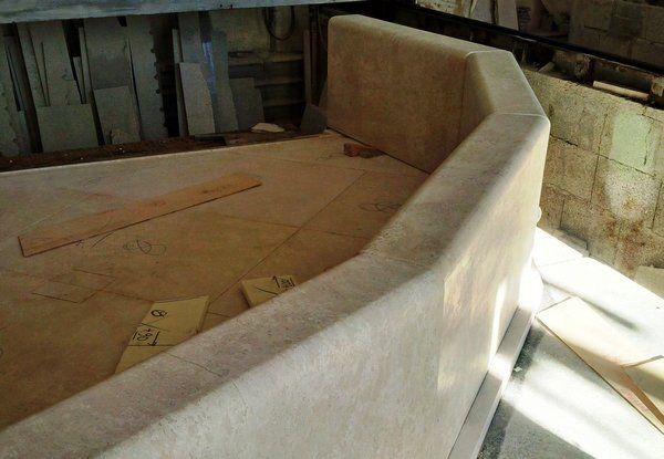 Fontana-piscina in Marmo di Orosei a diverse lavorazioni: granigliato, e levigato a pelle d'uovo