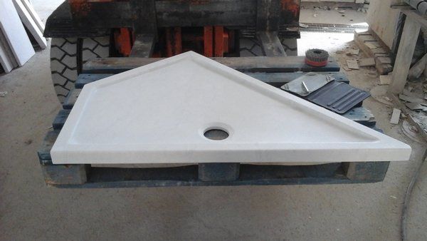 - Duschwannen und Duschtassen, herausgearbeitet aus 4, 5 oder 6 cm dicken Rohtafeln, geschliffen, mit Gefälle Richtung Abfluss und rutschfest gestrahltem Boden, Maße nach Wunsch.
