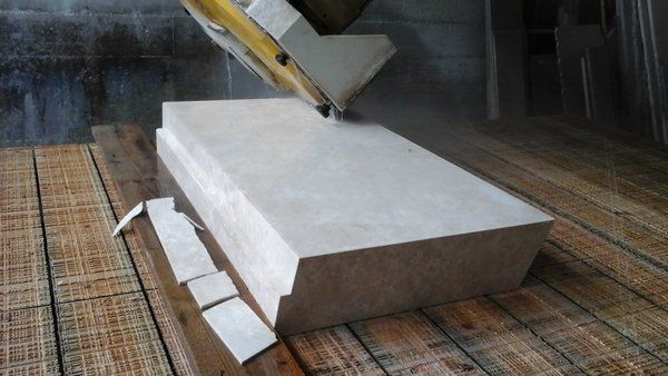 Zuschnitt der Rohtafelsegmente für den Beckenrand mit sichtbarem Anschlag für die Verbindung mit der Unterstruktur und den nicht rechtwinkligen Zuschnitten für die Diamantenkontur