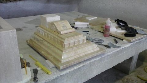 In the case of this console, which – as requested by the client – was created from stuccoed and polished Travertine Romano, the greatest difficulty lay in the manual removal of material and the inlaying work. This type of marble has varying hardnesses, which cause problems for manual stoneworking and often make it impossible to create the desired details.