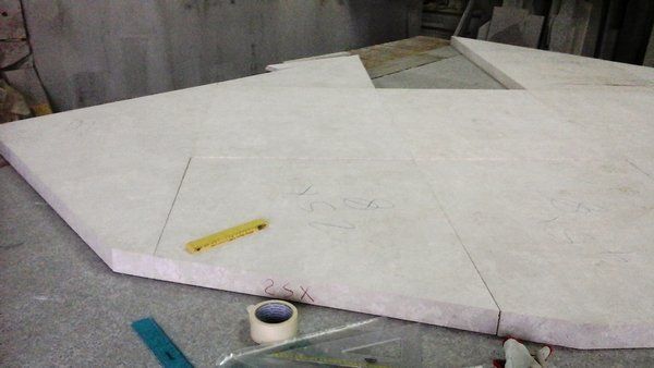 Zuschnitt der Rohtafelsegmente für den Beckenrand mit sichtbarem Anschlag für die Verbindung mit der Unterstruktur und den nicht rechtwinkligen Zuschnitten für die Diamantenkontur